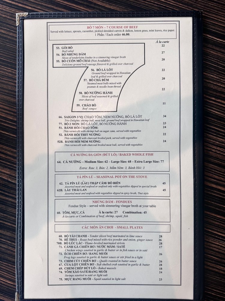 Start your culinary journey with mouthwatering appetizers like the Goi Cuon Cha Gio, a fresh imperial spring roll bursting with herbs or the Chao Tom, shrimp paste on sugar cane. For soup lovers, pho steals the spotlight with options to customize your bowl with premium beef cuts or succulent chicken. The Cha Oc Huong, featuring a flavorful snail and pork paste, promises an adventurous taste experience.